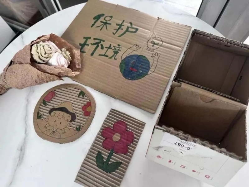 通过观看环保宣传短片,同学们了解了绿色环保方式,积极讨论快递盒改造再利用方法,用快递盒绘制环保宣传海报,用画笔尽情创作。在绘制的过程中,同学们不仅收获了快乐,为单调的快递盒增添新意,绿色环保理念还深入了每位同学的心中。