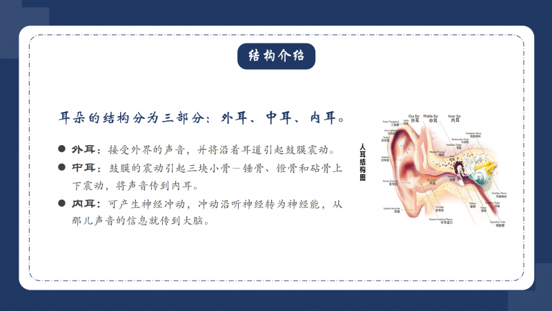 本次活动通过PPT向同学们介绍爱耳日的由来和意义,为学生展示耳朵的基本结构和功能,以及常见的耳部疾病和治疗方法。同时,还指导同学们如何正确使用耳机、如何避免长时间暴露在嘈杂环境中等正确的用耳习惯。并通过实践操作,让其更加直观地认识到保护听力的重要性。