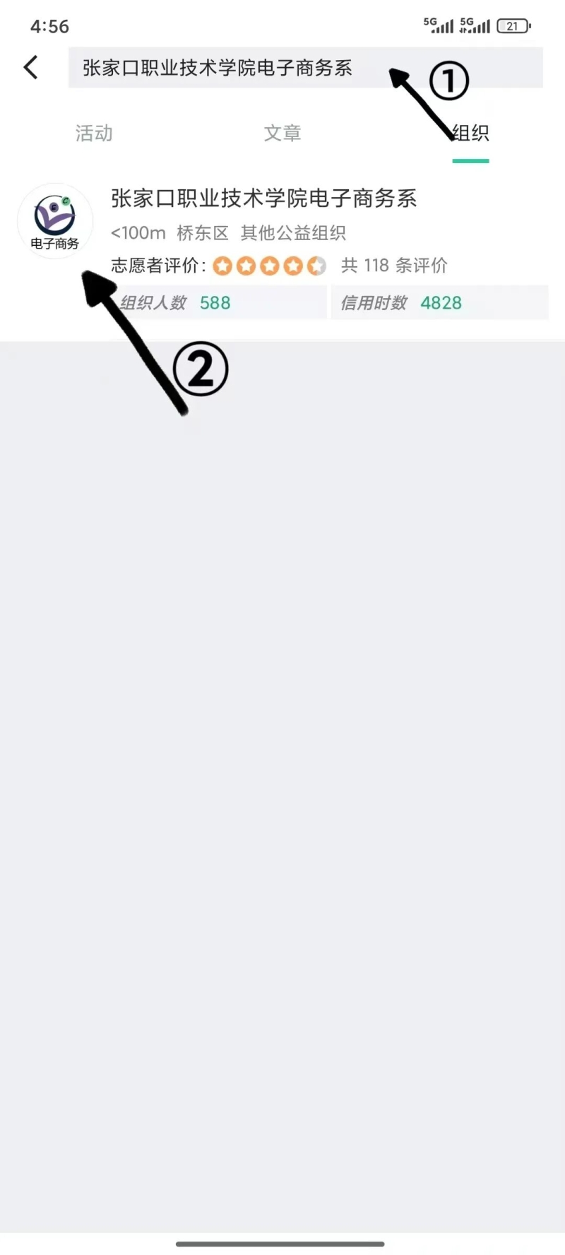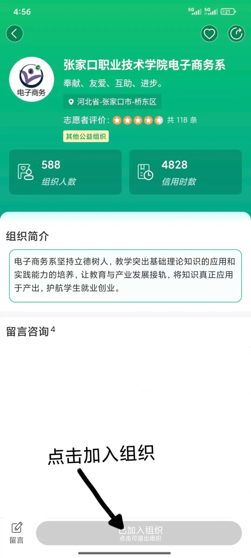 点击界面左上角修改定位,点击“找组织”,搜索并选择“张家口职业技术学院电子商务系”志愿组织,加入组织,等待组织负责人通过即可。