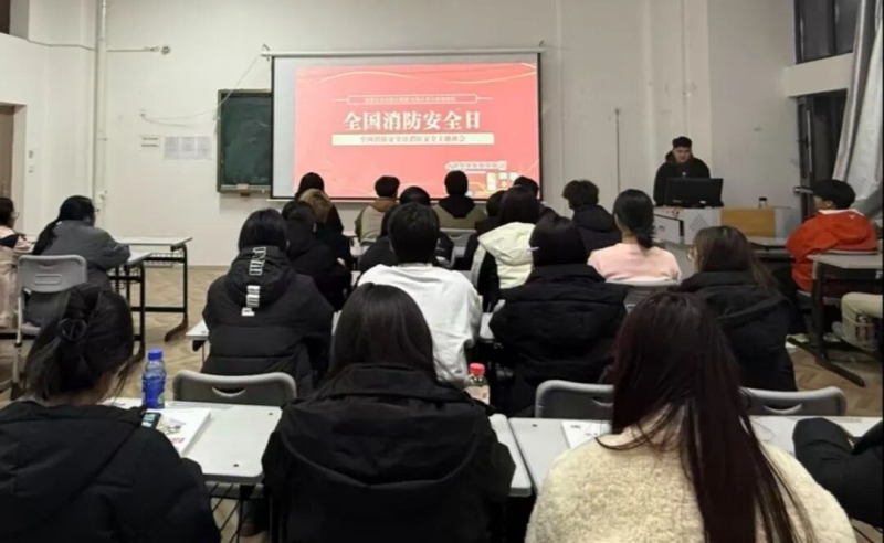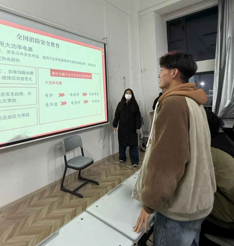 活动中,PPT内容涵盖消防日由来、消防安全月意义等基础认知,更聚焦电商系同学日常场景,通过清晰的图文对比,详解实训基地电子设备老化、办公区域插排串联使用等用火用电隐患的识别方法;借助动画演示,直观呈现灭火器“提、拔、握、压”的操作步骤及不同类型火灾的扑救要点。结合PPT中的事故数据与现场照片进行重点警示,并设置互动提问环节,鼓励同学就日常遇到的安全困惑发言,现场答疑解惑。